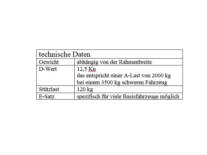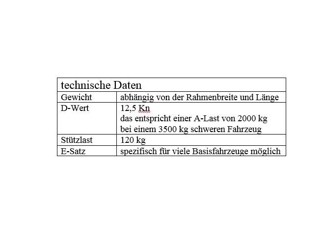 Diese AHK ist speziell auf Fahrzeuge mit ALKO-Chassis sowie tragfähigen Rahmenverlängerungen ausgelegt. Je nach Rahmenhöhen kann diese AHK mit speziellen Abhangplatten so angepasst werden, dass eine optimale Kugelhöhe erzielt wird. Durch die spezielle Geometrie dieser AHK ergeben sich verschiedene Montagevarianten, die es erlauben, eine max. Bodenfreiheit in Bezug auf die geforderte Kugelhöhe zu erzielen. Technische Eigenschaften dieser AHK siehe Bild – technische Daten. Ob diese AHK für Ihr Fahrzeug in Frage kommt, fragen Sie bitte konkret an – wir erstellen dann ein maßgeschneidertes Angebot.Für Fahrzeuge mit ALKO-Chassis und tragfähigen Rahmen